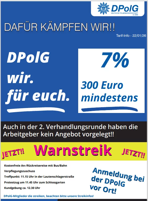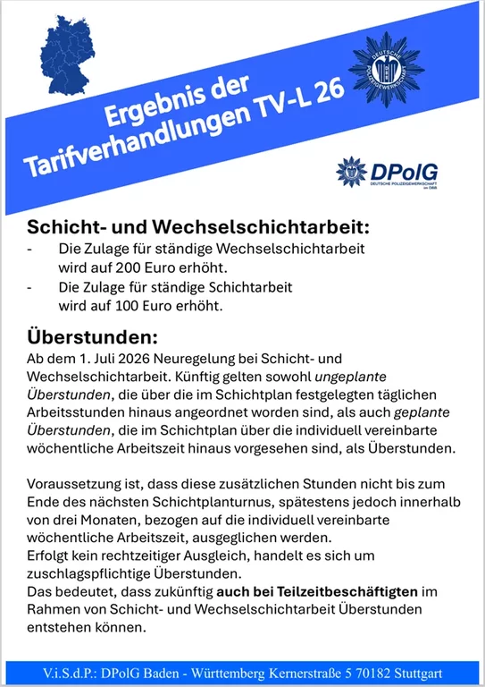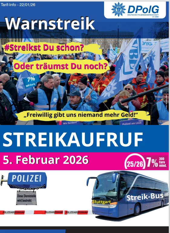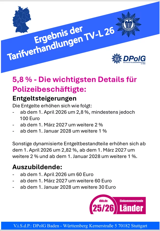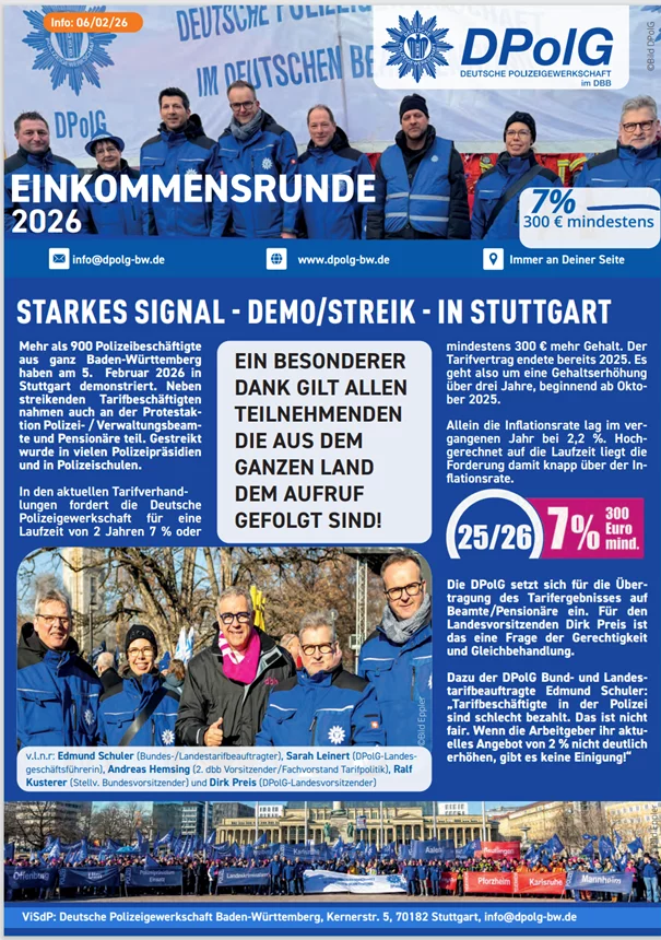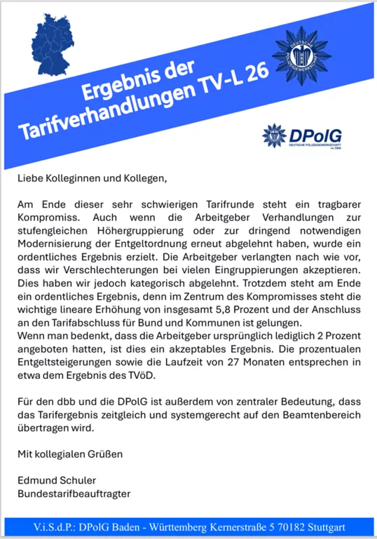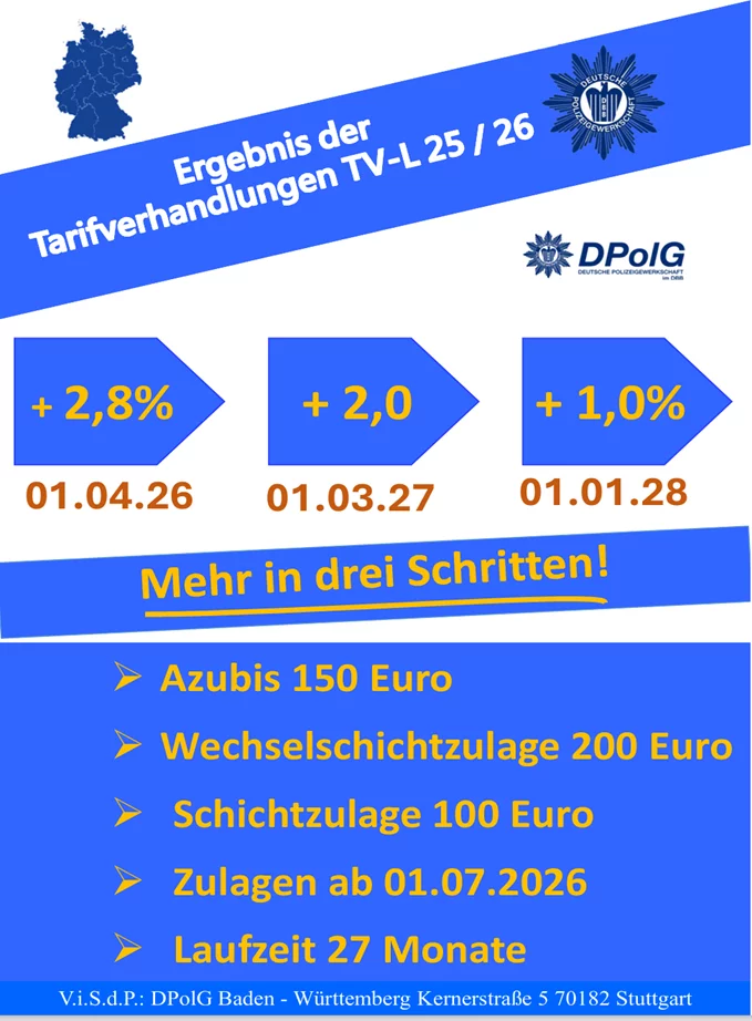 Der Landesvorsitzende der Deutschen Polizeigewerkschaft Baden-Württemberg, Ralf Kusterer, bezeichnete die Tarifeinigung für die Beschäftigte im öffentlichen Dienst vom Bund und den Kommunen als gutes Ergebnis für die betroffenen Beschäftigten.